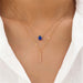 • This is a gold-toned, double-layer necklace featuring a teardrop blue zircon and a vertical bar pendant.